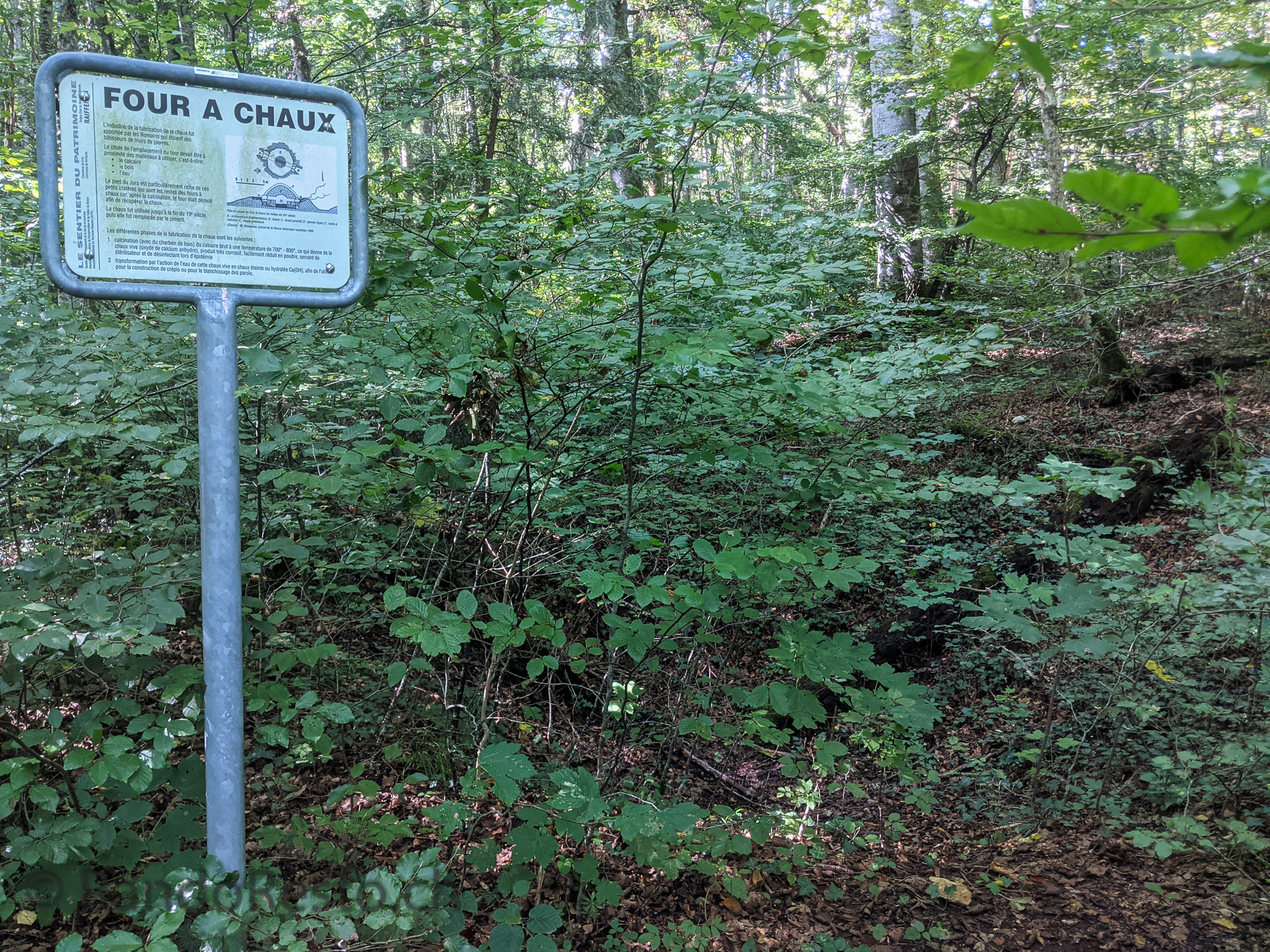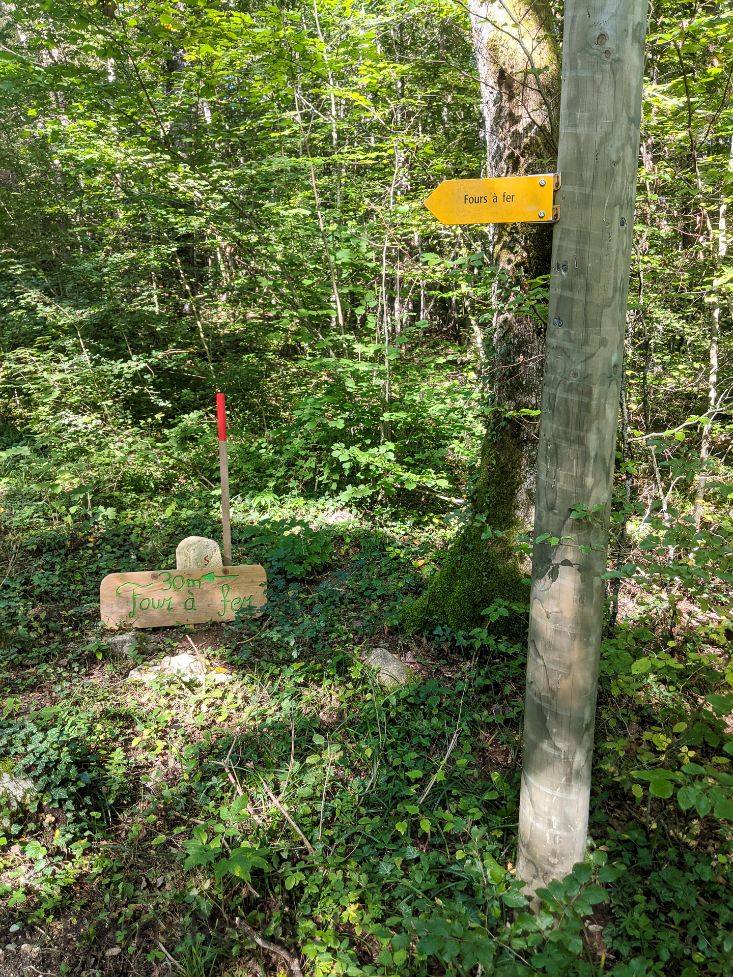 Retour par le même chemin et bifurquez à gauche avant de rentrer dans le village de Croy. Après un peu plus d’un km, on ne manquera pas de monter à droite (panneau indicateur) pour découvrir la Pierre Gravée, ou pierre des Gottettes. C’est un bloc erratique gravé de représentations de signes et de symboles figurant des scènes de chasse, dont les plus anciennes remontent à soixante siècles environ. Un témoin surprenant de la longue présence humaine sur le site. En poursuivant le chemin, on s’intéressera aux vestiges de fours à chaux et à fer remontant jusqu’au Haut Moyen Âge. Du four à chaux ne reste qu’un trou béant au milieu de la forêt ; il faut savoir qu’il était encore en activité au XIXe siècle. Les fourneaux à fer, utilisés pour la réduction du minerai de fer et datant du VIe siècle, sont presque intacts (mais protégés par une sorte de bunker vitré…). Trente mètres après le four à fer, prendre le chemin qui part à gauche dans la forêt.