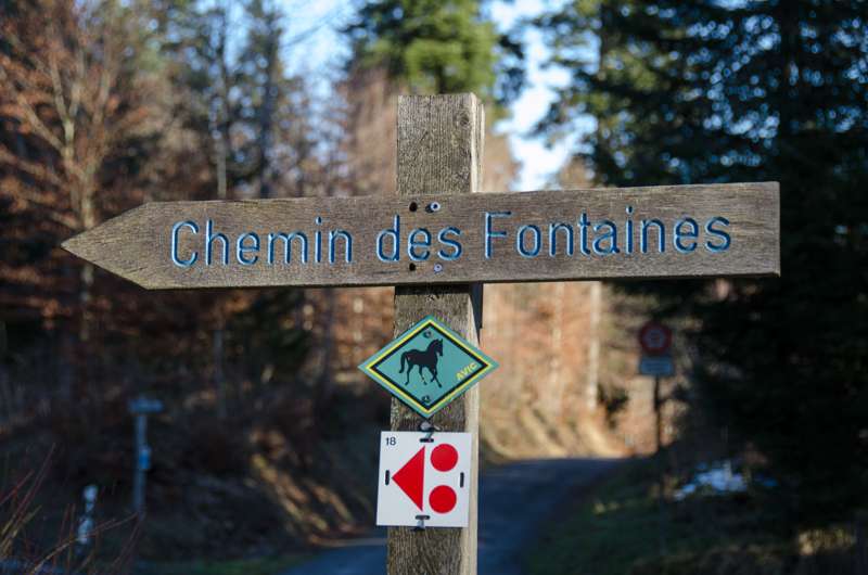 Le parcours fléché est jalonné de panneaux explicatif. Nous vous proposons de faire le parcours en sens inverse et de visiter les fontaines 10, 9, 8 et 7. Pour ne pas se perdre dans les bois du Jorat, il est préférable de se munir de <a href="www1.lausanne.ch/ville-de-nature/tourisme-vert-et-loisirs/balades-et-sentiers/fonataines-des-bois-du-jorat/extrasArea/0/links/0/linkBinary/chemin-des-fontaines-jorat.pdf" target="_blank">la carte du parcours</a> sur le site de la ville de Lausanne.